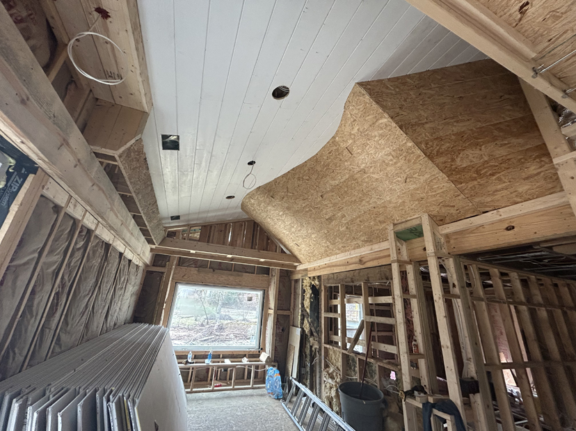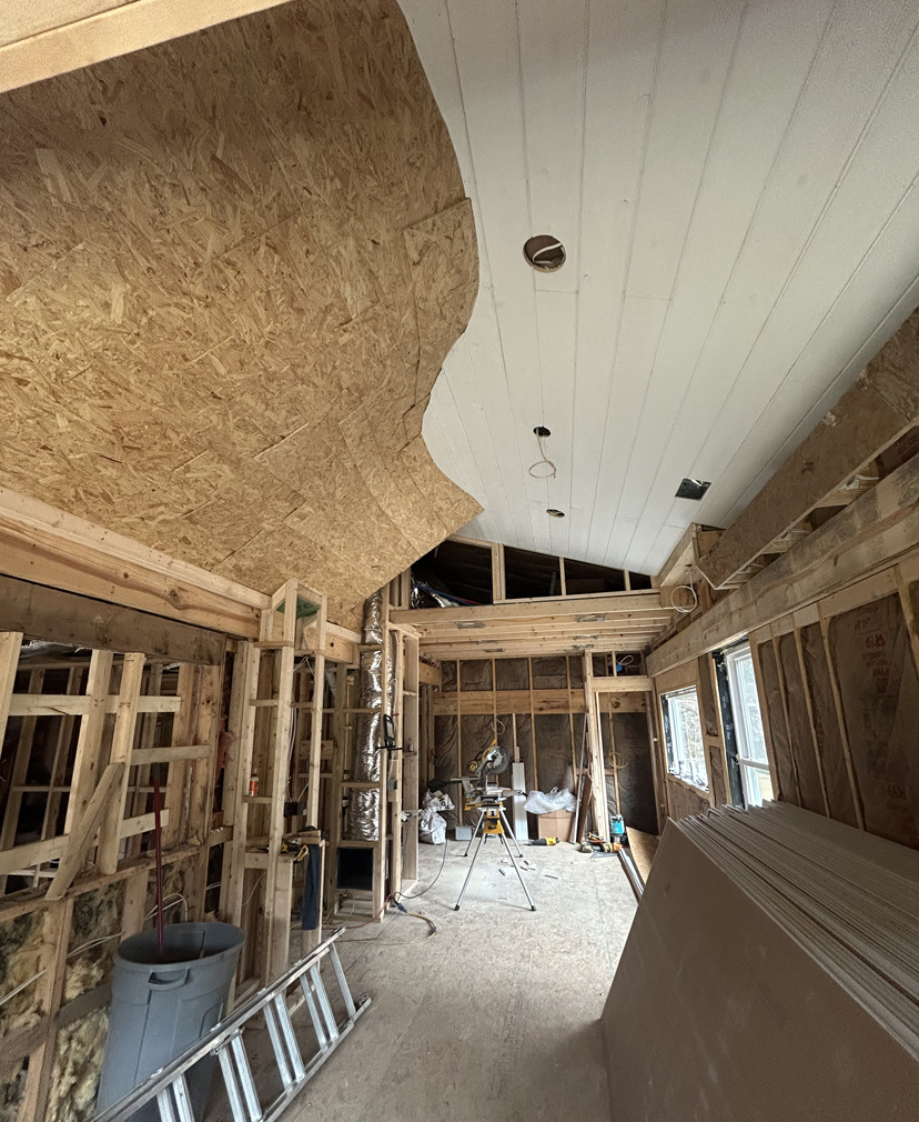 The entire cottage had to be rebuilt due to mold and water damage and the misstep in structure. We installed a new roof and recycled the old roof as upper structure siding. We also tried to maintain and clean as much interior wood as possible since the timbers were cut from trees on site and milled just 5 miles away.