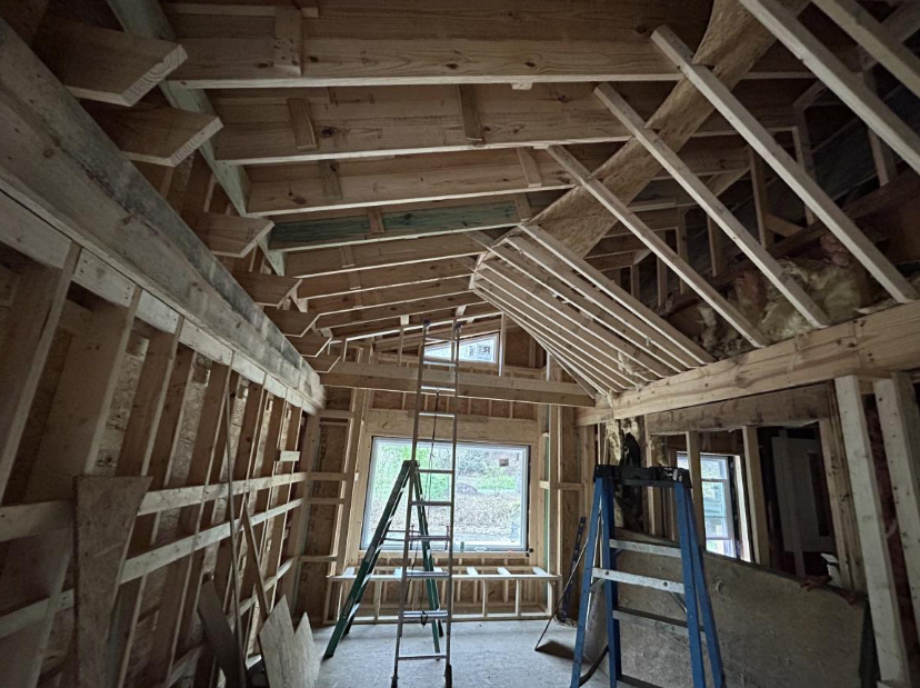 The entire cottage had to be rebuilt due to mold and water damage and the misstep in structure. We installed a new roof and recycled the old roof as upper structure siding. We also tried to maintain and clean as much interior wood as possible since the timbers were cut from trees on site and milled just 5 miles away.
